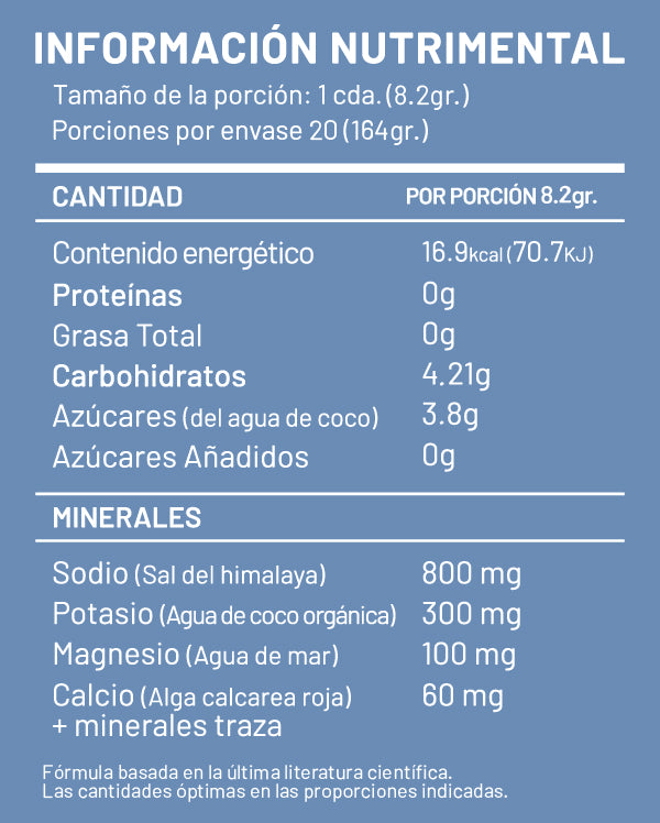 Agua de coco orgánica en polvo, Sal del Himalaya, Citrato de magnesio y Calcio.